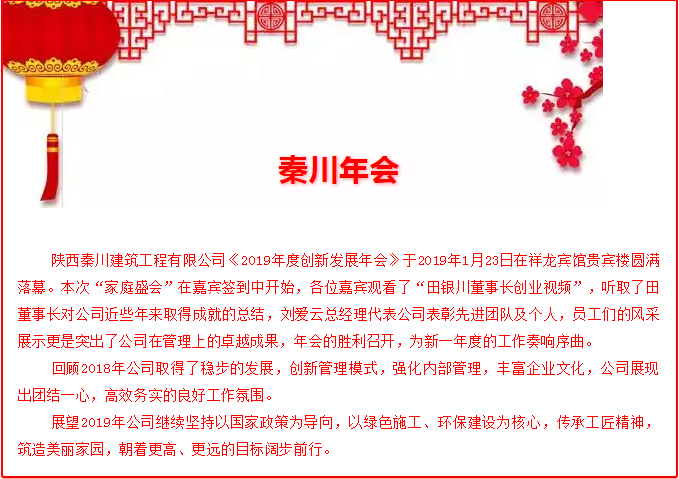 熱烈祝賀陜西秦川公司《2019年創(chuàng)新發(fā)展年會(huì)》圓滿落幕,恭祝大家:新年快樂(lè),身體健康,闔家幸福!